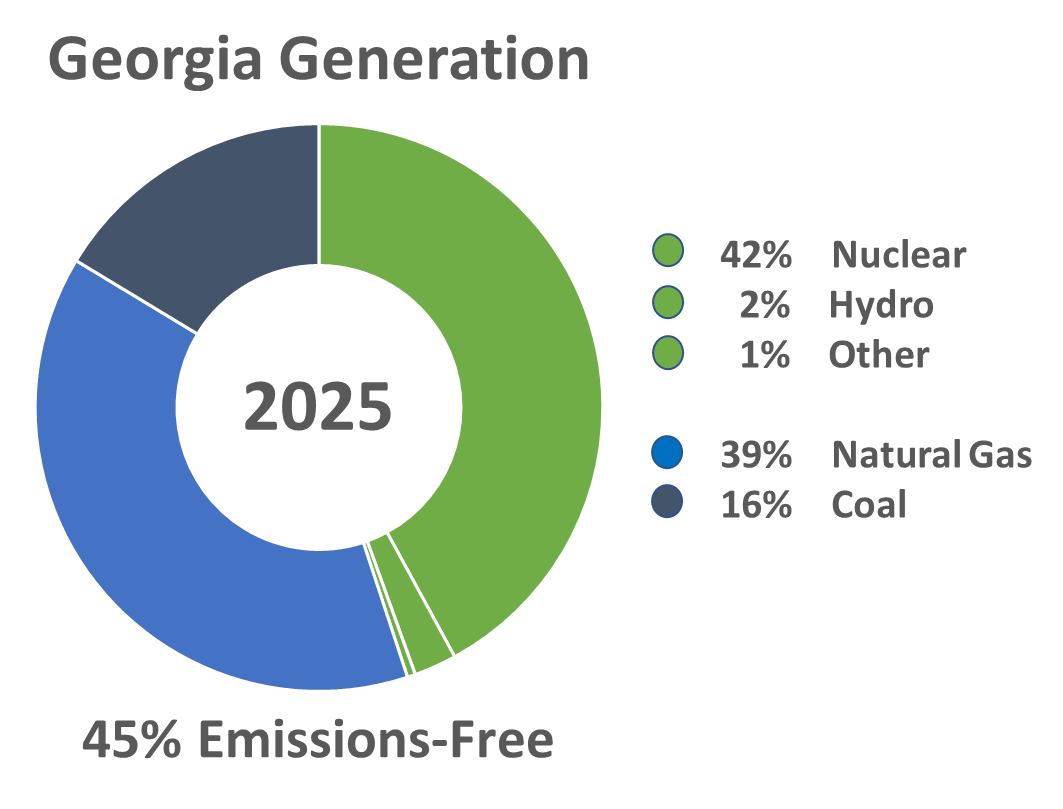 The Municipal Electric Authority of Georgia (MEAG Power) is a nonprofit, statewide generation and transmission organization that provides reliable, competitively-priced wholesale electricity to 49 member communities (Participants), who own and operate their local electric distribution systems. Its diverse, clean energy portfolio – delivering, on average, 65% emissions-free energy since 2016 – compares favorably with both the state and national averages.